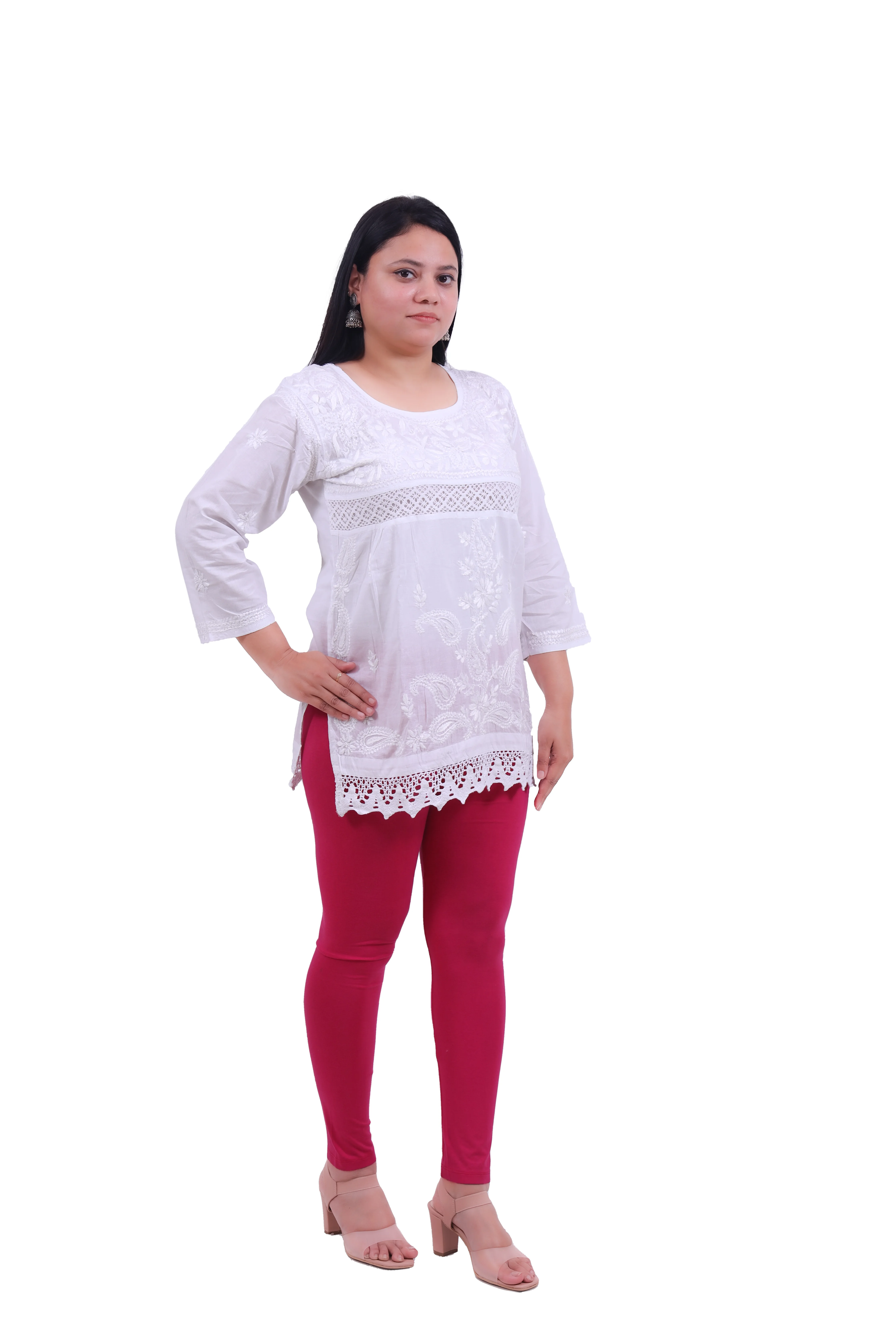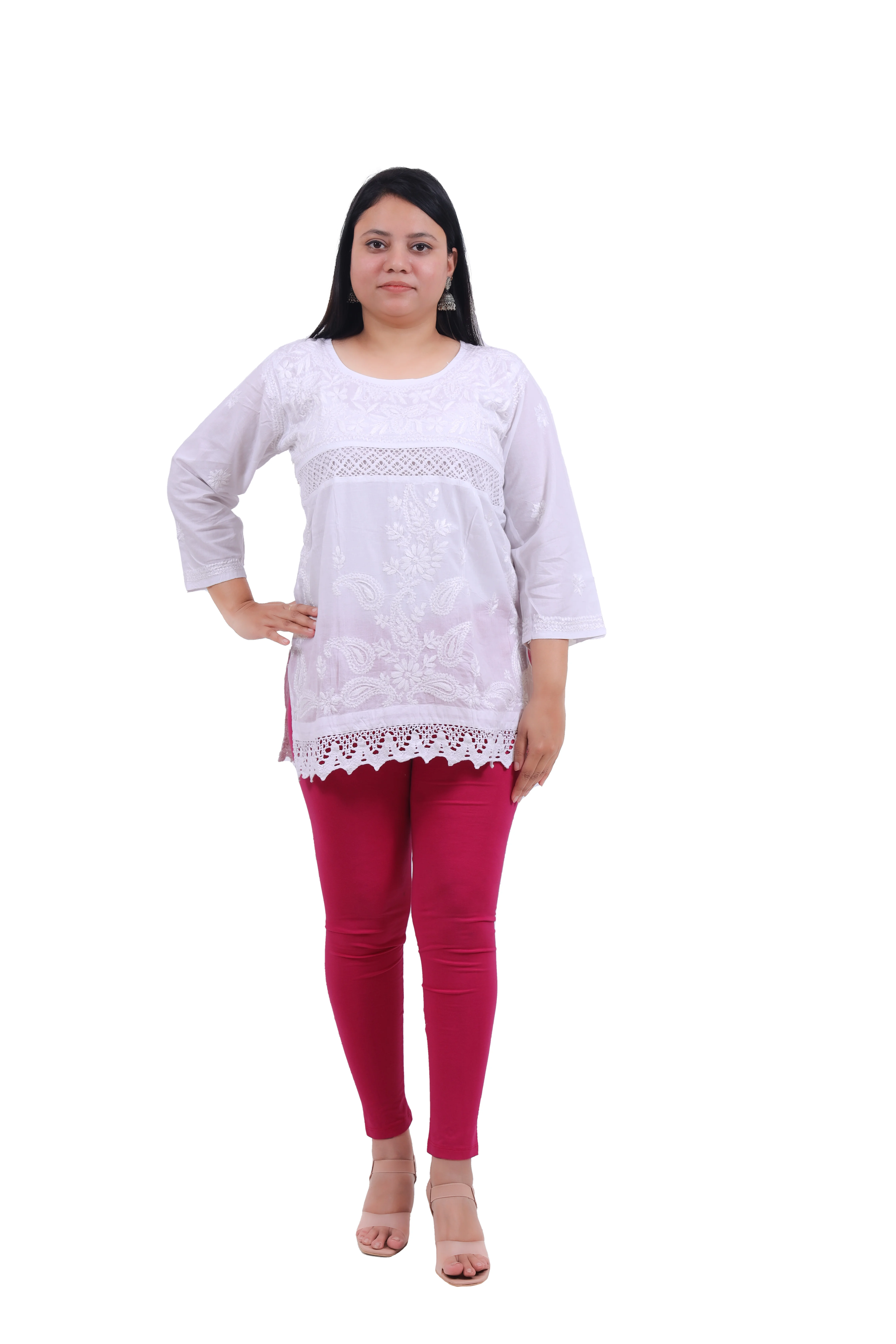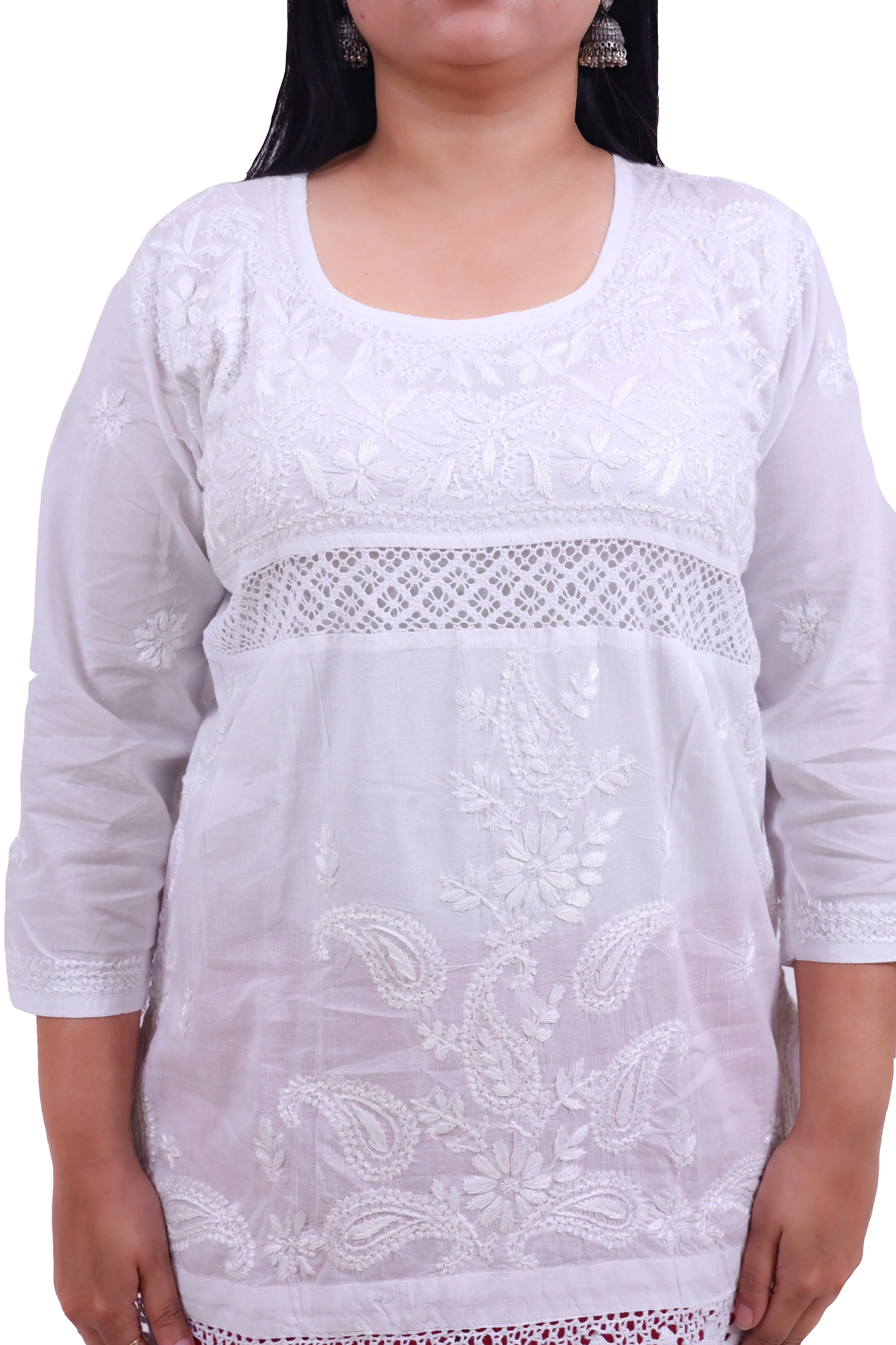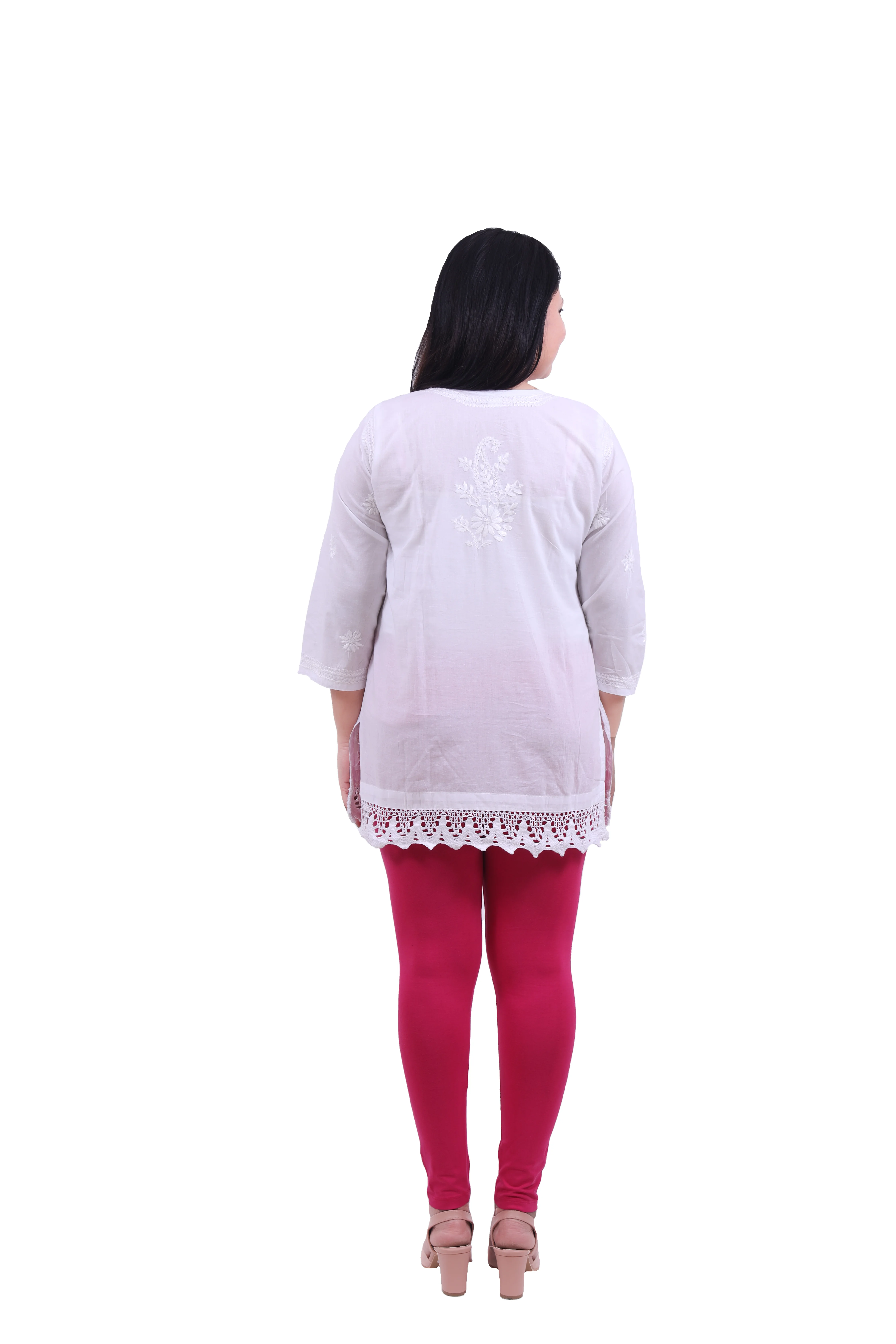 TABARRUK Hand Embroidered Lucknowi Chikankari short Cotton Kurti for Women-white